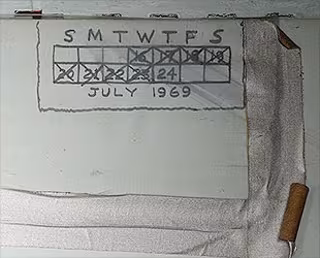 "Cada casilla, del 16 al 23 de julio está marcada. El 24 [día de aterrizaje] está escrita en forma numérica, pero no está marcada." agregó. "Uno piensa en el instinto humano de hacer ese tipo de cosas, como alguien en una celda o un preso en un campo de guerra. Mike Collins fue el hombre más solo en el mundo en el lado oculto de la Luna, y así tal vez decidió hacerlo." Incluso hay un trozo de plástico pegado sobre el calendario para protegerlo de las manchas.