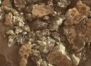 Cristales de azufre encontrados dentro de una roca después de que el rover Curiosity de la NASA pasara sobre ella y la aplastara el 30 de mayo de 2024. - NASA