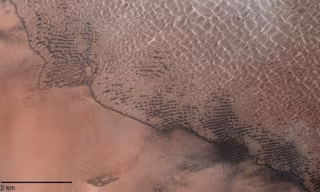 Las crestas de las dunas indican la dirección promedio del viento, en este caso, el viento proviene predominantemente de la parte inferior izquierda a la parte superior derecha de la imagen. A la derecha, se ven sedimentos más oscuros, más ricos en basáltico y libres de escarcha. También es a la derecha de la imagen donde las nubes blancas brillantes se destacan sobre los sedimentos más oscuros del suelo.