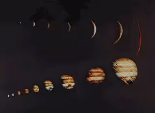 Las imágenes del fotomontaje de la NASA muestran a Júpiter creciendo en tamaño en una forma de media luna deformada y luego haciéndose más pequeña mientras la nave se alejaba. Aunque son muy rudimentarias respecto a las imágenes disponibles en la actualidad, se aprecia el paisaje de bandas y la mancha roja en el hemisferio sur.