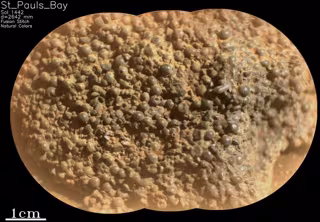 La roca, bautizada por el equipo como St. Pauls Bay, parecía estar compuesta por cientos de esferas milimétricas de color gris oscuro. Algunas de estas presentaban formas elípticas más alargadas, mientras que otras presentaban bordes angulares, posiblemente representando fragmentos de esferulitas rotas. Algunas esferas incluso presentaban pequeños orificios. Los científicos se preguntan que peculiaridad geológica podría producir estas extrañas formas.