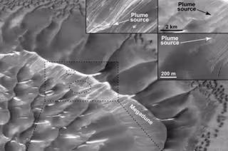 En imágenes de principios de la primavera, capturadas por dos cámaras diferentes en el Mars Reconnaissance Orbiter, la doctora Cynthia Dinwiddie de SwRI (Southwest Research Institute) notó columnas de material polvoriento en el aire asociados con los barrancos de dunas lineales en la pendiente de sotavento de la duna de arena. Estas pistas apuntan a procesos activos que involucran trozos de CO2 congelado o hielo seco, deslizándose por la duna de arena, levantando arena y polvo a lo largo del camino.