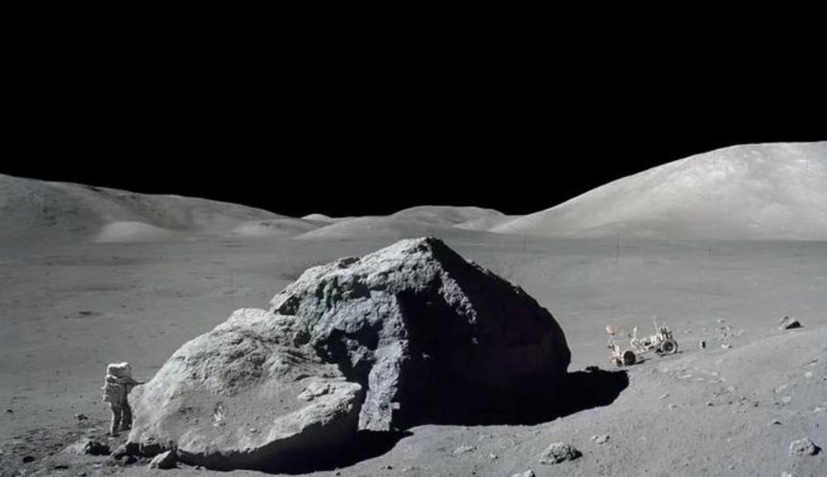 La imagen muestra al astronauta-geólogo de pie junto a una enorme roca lunar durante la misión Apolo 17 de la NASA en 1972. Los científicos de esta investigación utilizaron muestras de rocas de esta misión Apolo. - NASA/EUGENE CERNAN