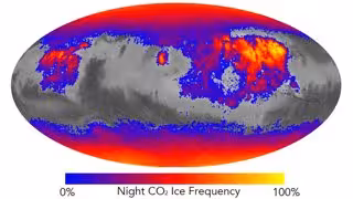 El dióxido de carbono es el principal ingrediente de la atmósfera de Marte. El planeta tiene amplias reservas de dióxido de carbono congelado enterrado en los casquetes polares. La descongelación estacional y la acumulación de escarcha de dióxido de carbono en altas latitudes en Marte ha sido estudiada durante años y vinculada a fenómenos extraños como las erupciones tipo geiser y grietas.
