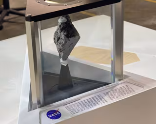 El objeto procede de la Instalación del Laboratorio de Muestras Lunar en el Centro Espacial Johnson de la NASA en Houston, y en su vitrina está inscrita como muestra lunar 76015,143.