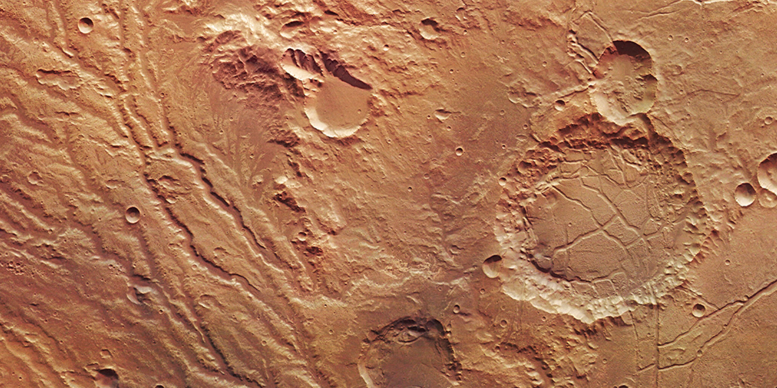 El agua ha dejado su huella en una variedad de maneras en esta escena de Marte captada por el orbitador Mars Express de la ESA.