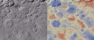 Debido a que la montaña no se eleva bruscamente sobre el suelo, es difícil verla en el mosaico de la izquierda, aunque se destaca una pequeña sombra en forma de media luna. La imagen a la derecha, que es un mapa de elevación del área, muestra dónde Kwanzaa Tholus es más prominente. Se trata de material adquirido por la nave Dawn de la NASA.