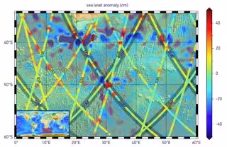 Datos de anomalías del nivel del mar de Copernicus Sentinel-6, superpuestos en un mapa que muestra productos similares de todas las misiones de altimetría de Copernicus: - CONTAINS MODIFIED COPERNICUS SENTINEL DATA (2020)