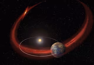 Una lluvia de meteoros se produce cuando un planeta pasa a través de una franja de escombros derramada por un cometa o un asteroide. Los pedazos más pequeñas de polvo, roca y hielo sienten la fuerza de la radiación solar, que los aleja del sol, creando una cola en el cometa a veces deslumbrante. Los trozos más grandes se depositan como un rastro de migas de pan a lo largo de la órbita del cometa, creando un campo de pequeños meteoritos.