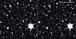 Lucy tomó dos fotografías el 2 y 5 de septiembre de 2023. A la izquierda, la imagen parpadea entre estas dos primeras imágenes de Dinkinesh. A la derecha, el asteroide está rodeado por un círculo para ayudar a su localización, informa la NASA.