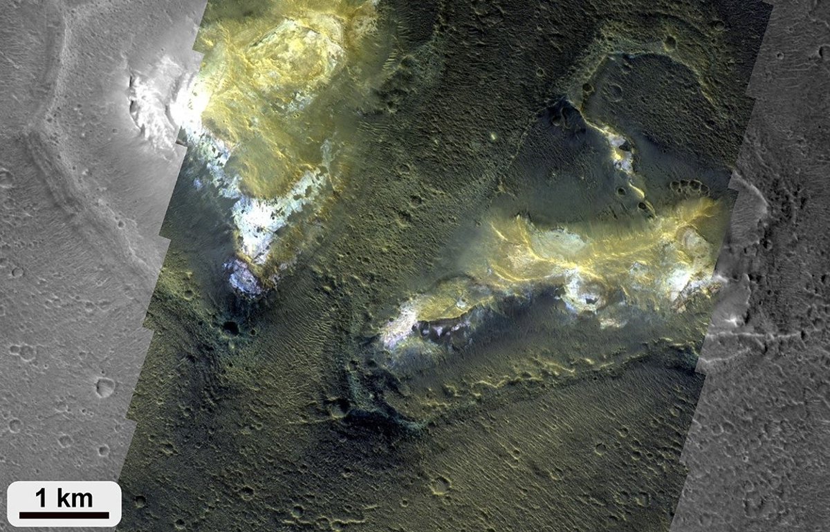 Dos montículos prominentes, que se elevan cientos de metros sobre las tierras bajas circundantes, muestran regiones brillantes ricas en minerales arcillosos. - ESA/TGO/CASSIS, NASA/JPL/MSSS/THE MURRAY LAB