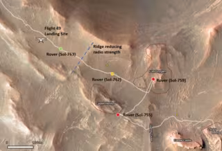 Después de algunos análisis forenses, Brown y su equipo creen que han determinado lo que sucedió. "En última instancia, este apagón de comunicaciones, el primero de su tipo, fue el resultado de dos factores", dijo Brown. "Primero, la topología entre el rover y el helicóptero fue un gran desafío para la radio utilizada por Ingenuity. Además, una cresta moderada ubicada justo al sureste del lugar de aterrizaje del Vuelo 49 separaba el helicóptero del área operativa del rover. El impacto de esta cresta solo disminuiría una vez que el rover se hubiera acercado incómodamente al helicóptero".
