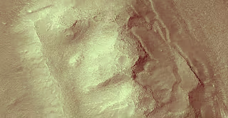 Mesetas dispersas como esta son comunes en la región de Cydonia, donde las tierras altas del sur de Marte, con abundantes cráteres, se transforman en las suaves tierras bajas del norte. Muchos lugares de latitudes medias como este también han experimentado actividad glacial, lo que probablemente redujo el tamaño de esta meseta y creó los valles achaparrados alrededor de su nivel más alto. Es probable que las manchas de material liso (especialmente en sus caras este y norte) sean restos de hielo de agua polvoriento.