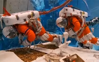 Utilizando versiones modificadas del traje espacial naranja usado en el despegue y aterrizaje del transbordador espacial, ambos bucearon en la piscina de 40 metros de profundidad del Centro Espacial Johnson de la NASA, instalación que ayuda a proporcionar la falta de gravedad necesaria para que los astronautas practiquen las caminatas espaciales.