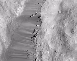 En la imagen de arriba, se muestran deslizamientos y barrancos en primer plano a lo largo del borde este del cráter Occator, célebre por la mancha brillante en su centro. Ha sido difundida junto a otras por el científico Bob King en su blog.