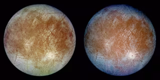 Esta imagen, tomada por la nave espacial Galileo en 1996, muestra dos vistas del satélite cubierto de hielo de Júpiter, Europa. - NASA JET PROPULSION LABORATORY