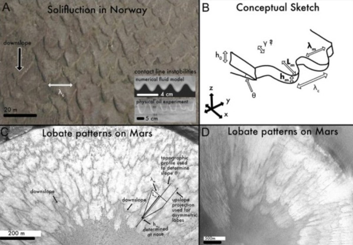 Los investigadores demuestran que esta diferencia de altura es precisamente la esperada si las propiedades físicas del suelo y la menor gravedad de Marte permiten que los lóbulos crezcan antes de colapsar. En la Tierra, los lóbulos de solifluxión se forman cuando el suelo se congela y se descongela parcialmente, aflojando el suelo lo suficiente como para que pueda deslizarse lentamente ladera abajo con el tiempo.