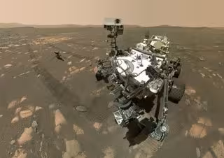 El rover Perseverance de la NASA en Marte usó una cámara en el extremo de su brazo robótico para tomar esta foto de sí mismo con el helicóptero Ingenuity cerca.