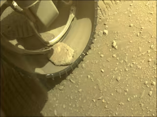 Durante el recorrido por el pedregoso cráter Jezero de Marte, una piedra ha quedado atascada en el interior de una de las ruedas del rover Perseverance de la NASA.