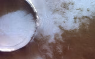 El borde de este cráter rico en hielo capta la luz del sol de la mañana en las altas latitudes septentrionales de Marte, fotografiado por el orbitador Exomars TGO (Trace Gas Orbiter) de la ESA el 26 de octubre.