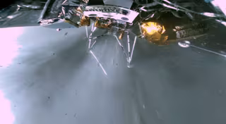 La imagen de arriba muestra a Odiseo haciendo el primer contacto con la superficie lunar el pasado 22 de febrero mientras el motor de descenso de la nave espacial estaba acelerando. La fotografía muestra una de las patas de la nave mientras realizaba su tarea principal, absorbiendo el primer contacto con la superficie lunar. Con el motor de metano líquido y oxígeno líquido del módulo de aterrizaje aún acelerando, proporcionó estabilidad.