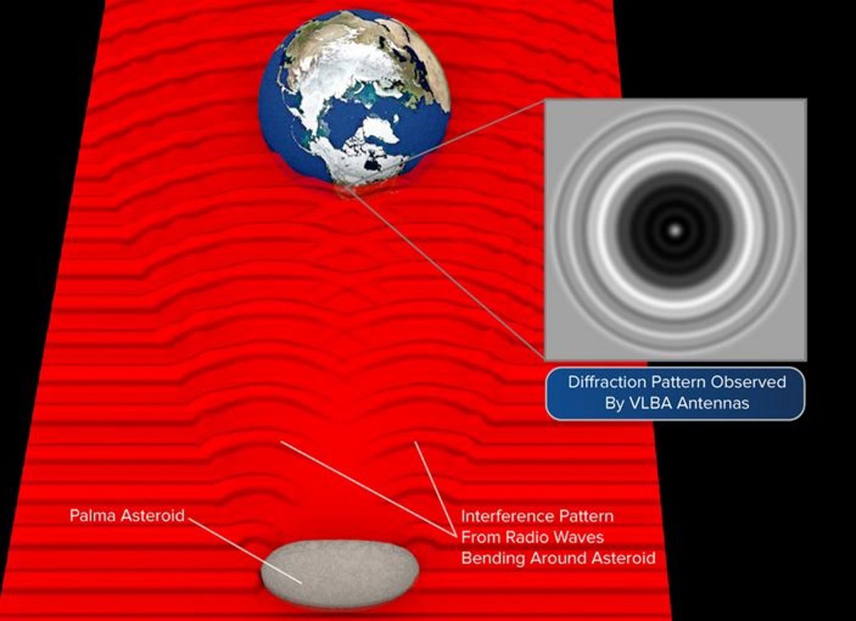 El asteroide, llamado Palma, se encuentra en el cinturón principal de asteroides entre Marte y Júpiter. Descubierto en 1893 por el astrónomo francés Auguste Charlois, Palma completa una órbita alrededor del Sol cada 5,59 años. El 15 de mayo de 2017, oscureció las ondas de radio de una galaxia llamada 0141 + 268 con la sombra de la radio trazando un camino que se extiende aproximadamente de suroeste a noreste, cruzando la estación VLBA en Brewster, Washington. La sombra aceleró a través de la superficie de la Tierra a 32 millas por segundo.