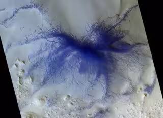 Esta imagen es una representación de color compuesto donde las características que son más azules en comparación con el color promedio de Marte se muestran en tonos azules brillantes. En color real, las rayas aparecerían rojo oscuro.