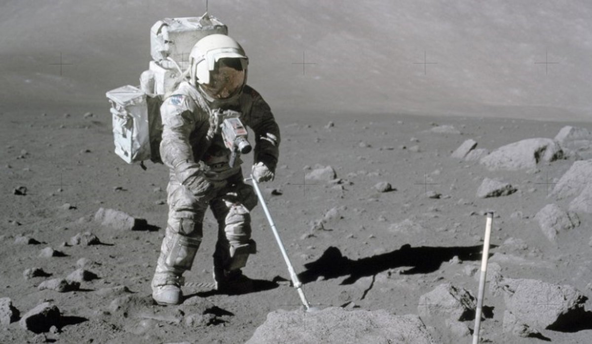 El astronauta del Apolo 17, Harrison Schmitt, recoge muestras lunares con una cuchara de muestreo ajustable durante la misión a la Luna de 1972. - NASA