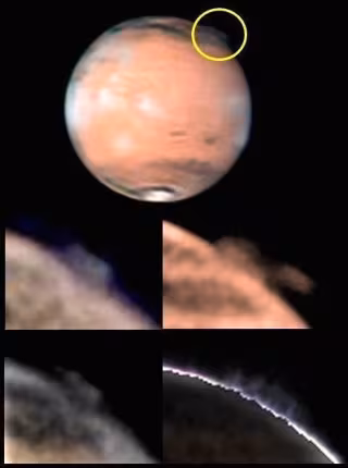 Astrónomos aficionados usando telescopios en la Tierra fueron los primeros en informar de un inusual penacho de nube en 2012, que alcanzó la impresionante altitud de 250 kilómetros de altura por encima de la superficie de Marte. Aquella característica se desarrolló en menos de 10 horas, cubrió un área de hasta 1.000 por 500 kilómetros, y permaneció visible durante unos 10 días.