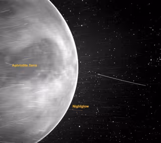 En Venus, la cámara detectó un borde brillante alrededor del borde del planeta que puede ser un resplandor nocturno: luz emitida por átomos de oxígeno en lo alto de la atmósfera que se recombinan en moléculas en el lado nocturno. La característica oscura prominente en el centro de la imagen es Afrodita Terra, la región montañosa más grande de la superficie de Venus. La característica parece oscura debido a su temperatura más baja, unos 30 grados Celsius más fría que su entorno.
