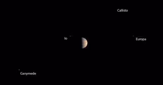 La nave espacial se acerca sobre el polo norte de Júpiter, proporcionando una buena perspectiva sin precedentes del sistema de Júpiter, incluidas su cuatro grandes lunas: Ganimedes, Calisto, Io y Europa.
