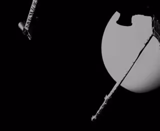 La antena de ganancia media del Mercury Planetary Orbiter es visible en la parte superior de la imagen, junto con el brazo del magnetómetro, que se extiende desde la parte superior derecha del marco. En el momento en que se tomó la imagen, la nave espacial estaba a 17.000 kilómetros de Venus.