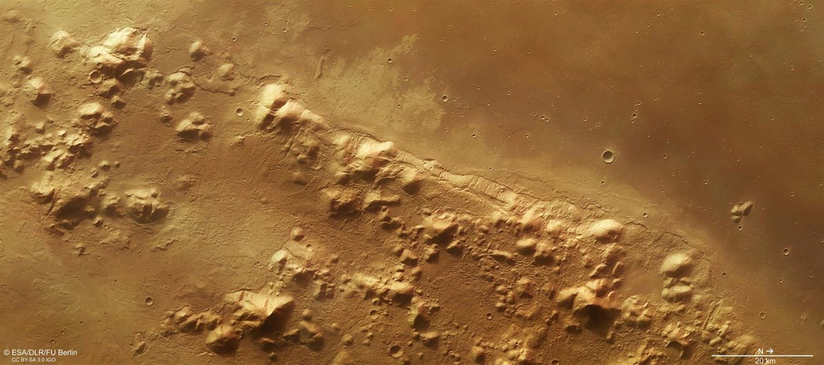 Esta formación geológica proporciona información detallada sobre la metamorfosis de un paisaje marcado por los cambios climáticos registrados en Marte hace millones de años. Las imágenes que se muestran aquí fueron adquiridas por la Cámara Estéreo de Alta Resolución (HRSC) a bordo de la nave Mars Express de la ESA, operada por el Centro Aeroespacial Alemán (DLR).