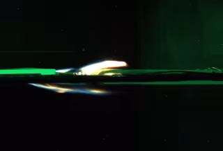 La imagen de arriba presenta una vista de borde de la llama de Saffire que se desarrolla sobre una muestra de un centímetro de espesor de un material de tipo plexiglás encontrado en una nave espacial. El color azul es típico de las llamas de microgravedad y se mueve de izquierda a derecha a 20 centímetros por segundo.
