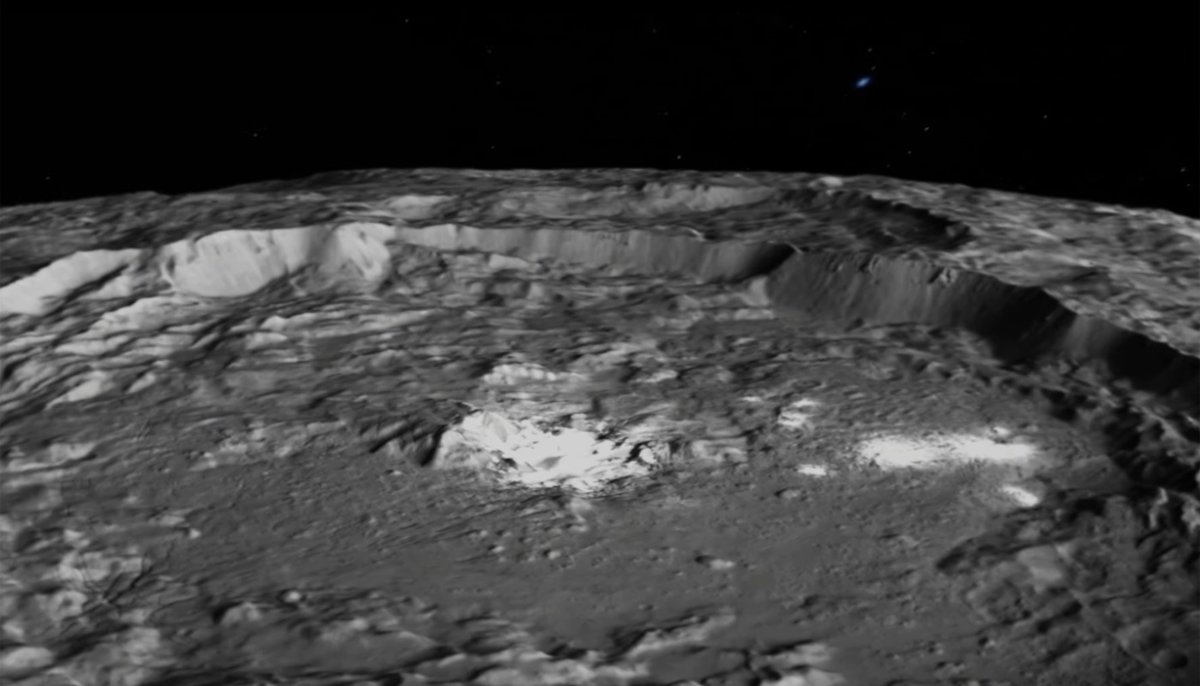 El video fue producido utilizando 548 imágenes adquiridas por la cámara de encuadre alemana a bordo de la nave espacial Dawn, más de 10.000 combinaciones estéreo, y 106 millones de puntos calculado en la superficie con los que los investigadores planetarios del DLR prepararon un modelo de elevación tridimensional del planeta enano .