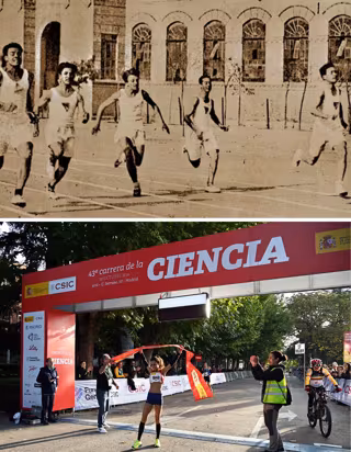 Arriba, imagen de la carrera cross-country celebrada en 1925 (Residencia de Estudiante); abajo, llegada a meta en la categoría femenina durante la celebración de 2024 (Erica Delgado, CSIC). - CSIC