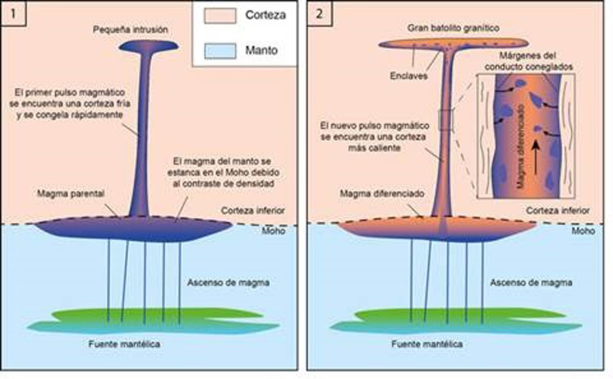 "Antes de emplazarse a poca profundidad, el magma generado en el manto se concentra en la discontinuidad de Mohorovii o Moho para abreviar, el límite entre el manto y la corteza terrestre, debido al cambio brusco de densidad. Una vez consigue ascender, el primer pulso magmático se encuentra con una corteza fría y solidifica de golpe. Los siguientes pulsos ascienden por el mismo conducto, arrancando fragmentos de él en su ascenso y dando lugar a los enclaves", ha explicado Antonio Castro, investigador del MNCN que también firma el artículo.