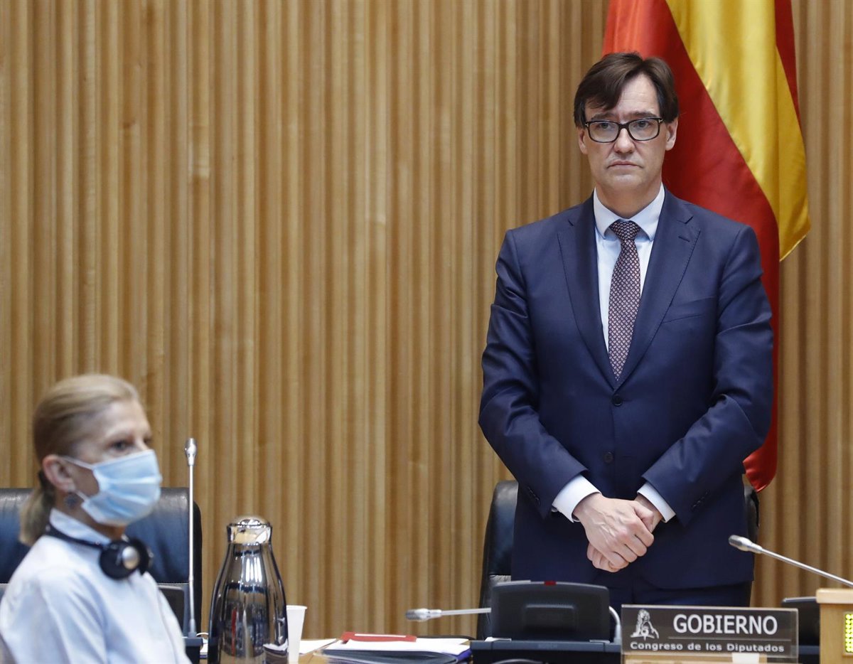 El ministro de Sanidad, Salvador Illa guarda un minuto de silencio por las víctimas de la pandemia antes de comparecer en la Comisión de Sanidad del Congreso - Pool