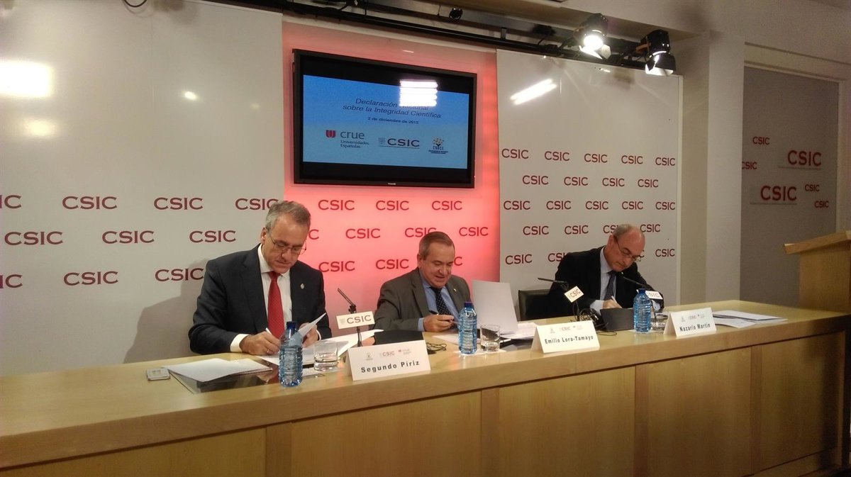El Consejo Superior de Investigaciones Científicas (CSIC), la Confederación de Sociedades Científicas de España (COSCE) y CRUE Universidades Españolas han firmado este miércoles una Declaración Nacional sobre Integridad Científica, con la que pretenden prevenir la mala praxis en la ciencia española.