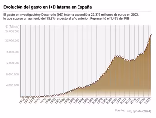 El gasto en Investigación y Desarrollo (I+D) interna ascendió a 22.379 millones de euros en 2023, lo que supuso un aumento del 15,8% respecto al año anterior. Dicho gasto representó el 1,49% del Producto Interior Bruto (PIB).