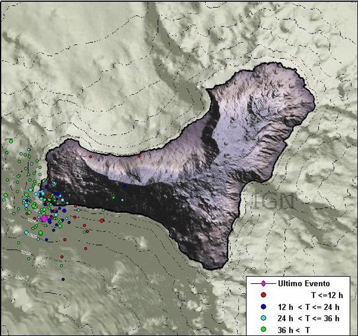 La red de vigilancia volcánica de seguimiento 24 horas del Instituto Geográfico Nacional (IGN) ha registrado en la isla de El Hierro durante la noche un total de 13 sismos de entre 2.5 y 1.6 grados de magnitud en la escala de Richter.