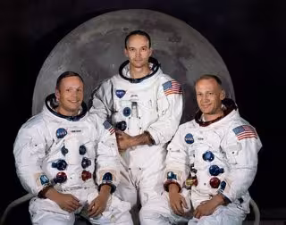 La tripulación del Apolo 11 se completaba con Michael Collins, que quedó orbitando la Luna a bordo del módulo de mando Columbia, al que el módulo de aterrizaje se reacopló tras abandonar la superficie lunar con numerosas muestras y volver a la Tierra.