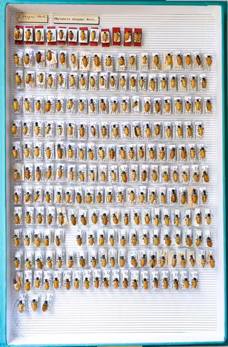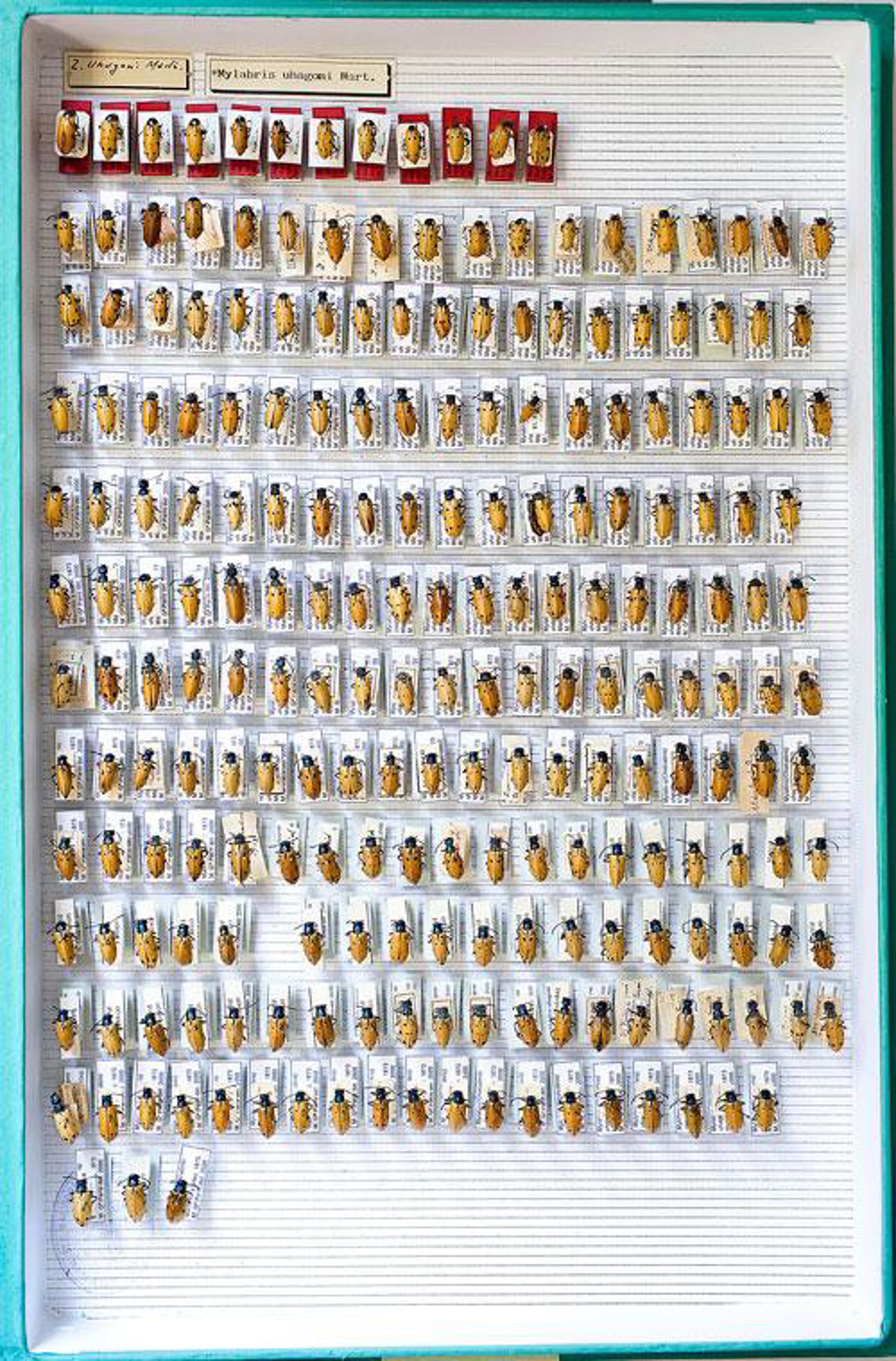 Caja entomológica de la colección del Museo Nacional de Ciencias Naturales (MNCN-CSIC) con ejemplares de la especie Miylabris uhagonii, un coleóptero que, hasta los años 60, se encontraba bien distribuida por la península ibérica - MNCN-CSIC