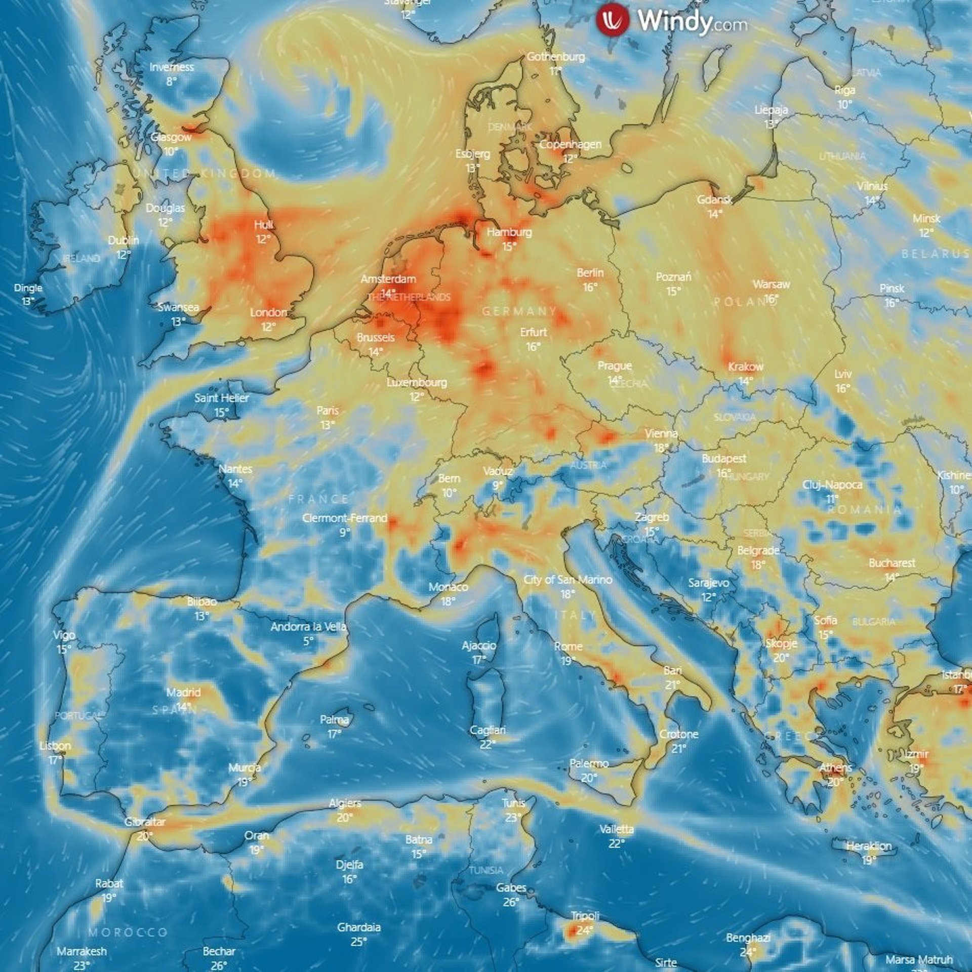 Sin embargo, el resto del continente aparece con zonas en rojo de manera más abundante que en España, destacando especialmente la zona del Benelux (Bélgica, Holanda y Luxemburgo) y Reino Unido, donde los niveles son "particularmente altos".