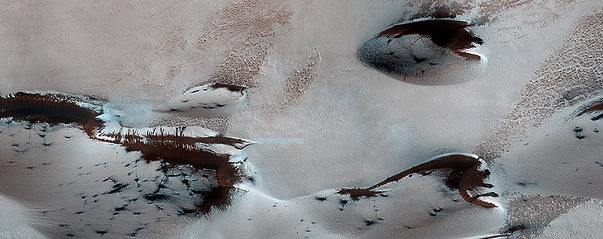 La primavera llega a Marte y los telescopios orbitales comienzan a captar las primeras consecuencias de la llegada del calor, como el deshielo en las dunas de arena del planeta rojo. Según ha informado la NASA, la zona más septentrional de Marte está comenzando a perder su cubierta helada y ya se pueden observar algunas de las 'cimas' de estas dunas, con su color original.