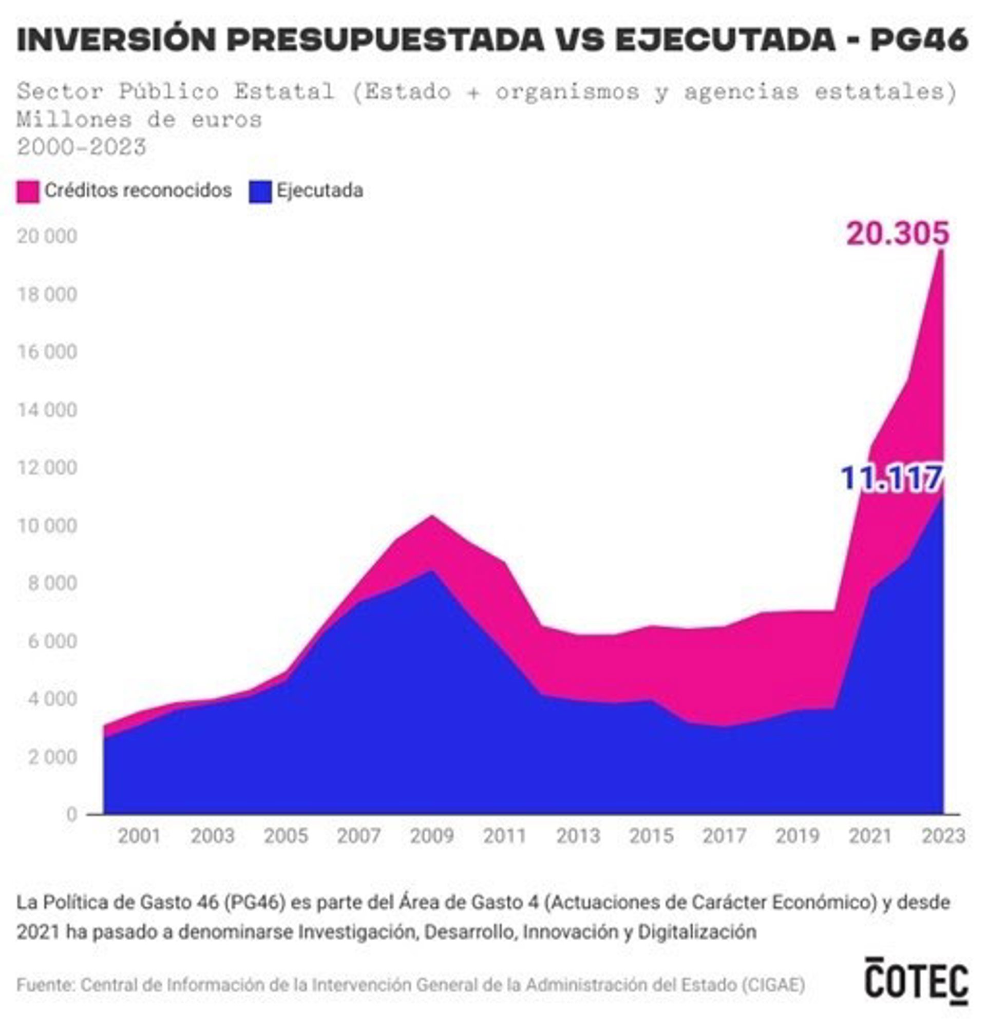 El análisis de COTEC señala que el Ministerio de Ciencia e Innovación presentó la mejor tasa de ejecución presupuestaria de los fondos europeos dedicados a la Política de gasto 46 (del 97%, implementó 1.103 millones de euros de los 1.133 millones de gasto no financiero europeo presupuestados para 2023). Sin embargo, su tasa de ejecución agregada quedó muy deslucida (cae hasta el 62%), una vez considerados también los fondos de origen nacional (deja de ejecutar 729 millones de euros de gasto no financiero y, sobre todo, 2.364 del capítulo financiero).