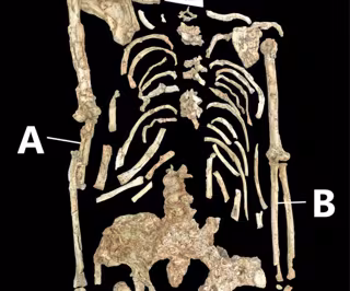 El esqueleto superior de 'Little Foot' resaltando el cúbito derecho (A) y el cúbito izquierdo (B) - MARC R. MEYER