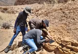 Los investigadores examinan evidencia de fósiles de animales, que tienen alrededor de 550 millones de años, en el trabajo de campo en Namibia. - UNIVERSIDAD DE EDIMBURGO
