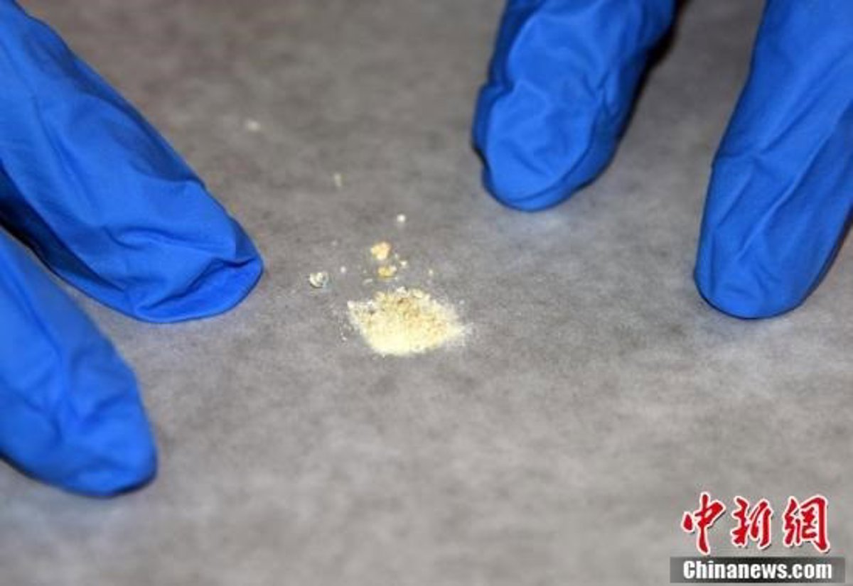 Muestras de los residuos de cosméticos de plomo blanco sintético encontrados en un objeto de bronce excavado en una tumba - CHINANEWS.COM
