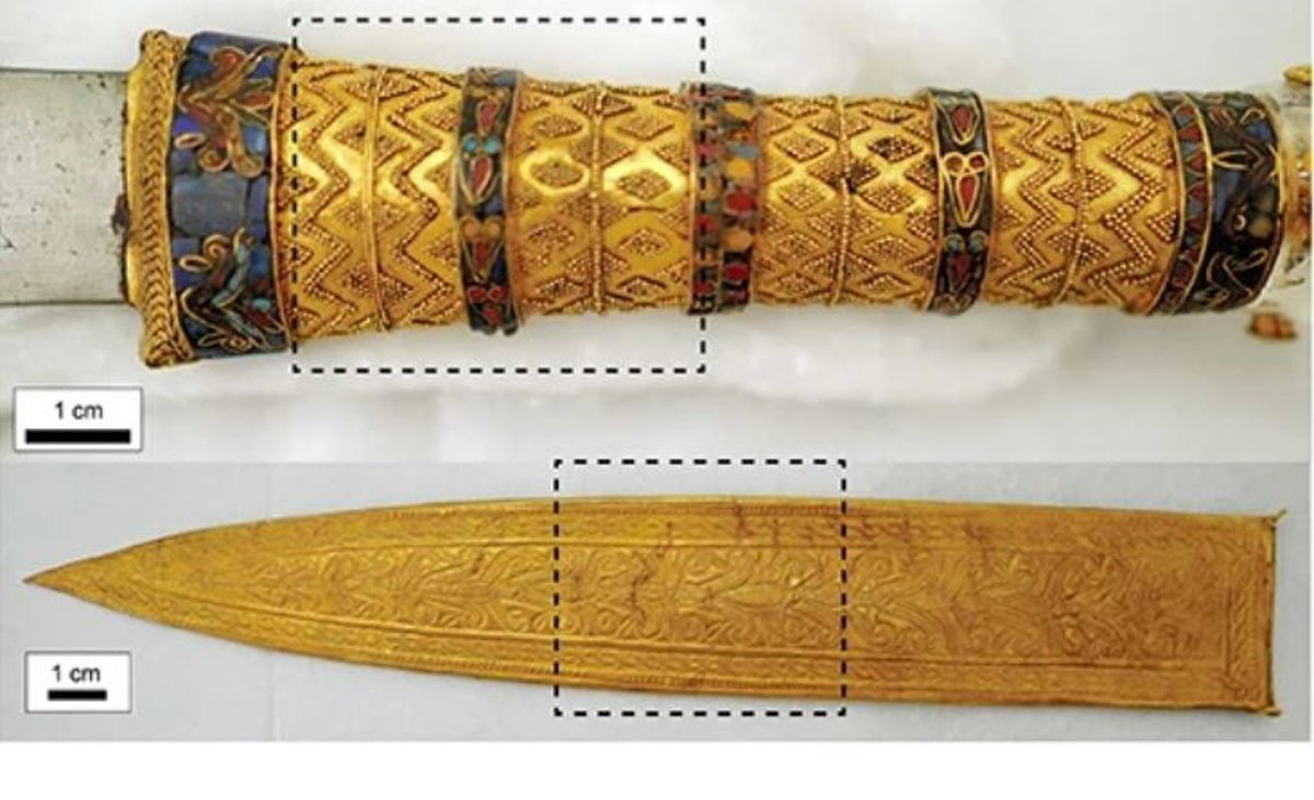 La empuñadura de oro de la daga también contenía rastros de calcio, que normalmente no se encuentran cuando se procesa el oro. Eso llevó a la creencia de que se usaba yeso para unir los adornos a la empuñadura.